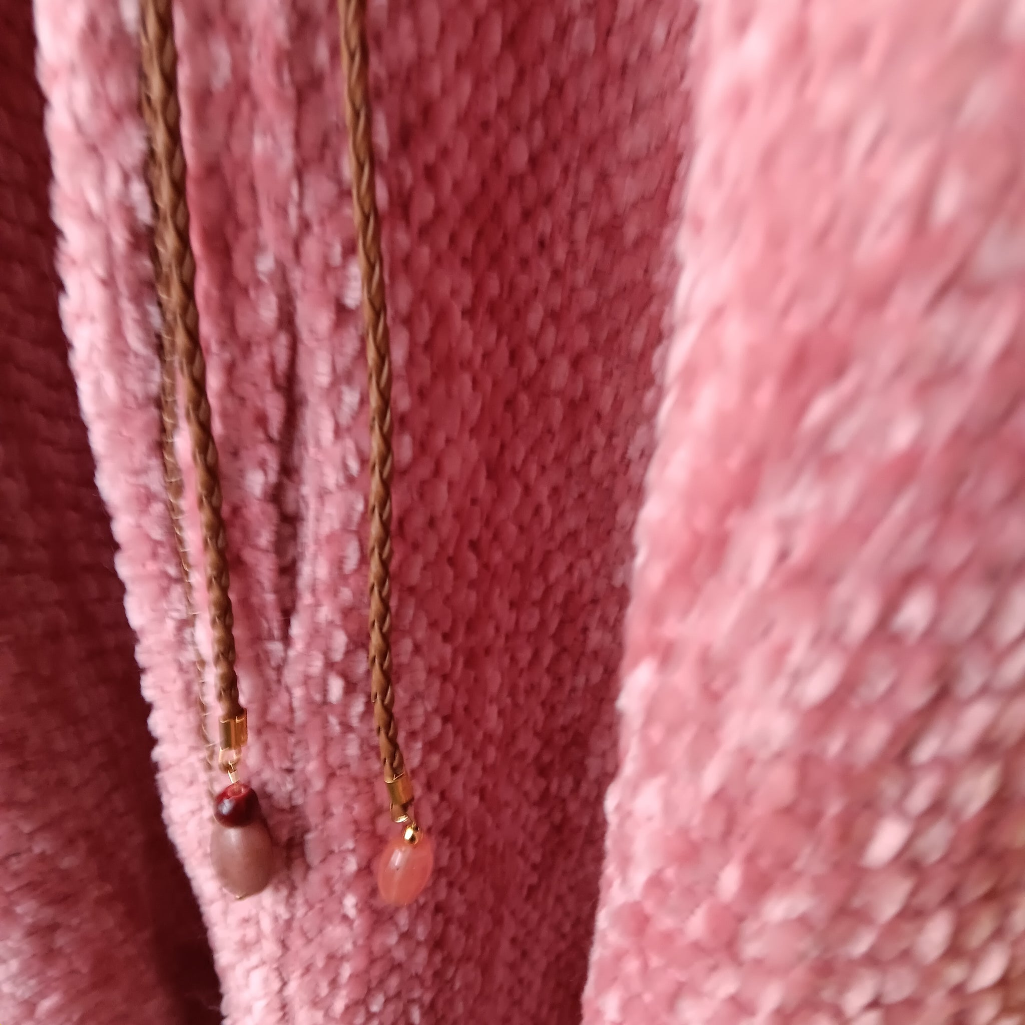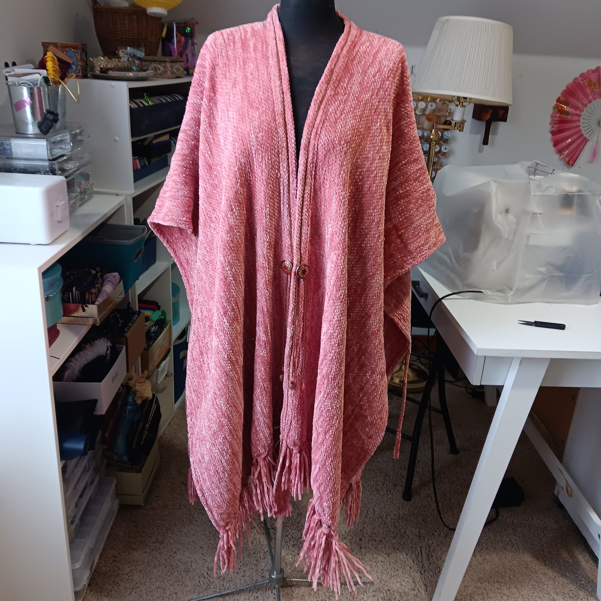 The neck and front areas are trimmed with brown braided rawhide and vintage earrings act as buttons, with Rhodonite and Watermelon Quartz beads hanging from them. These ties can be used to loosely tie the shawl together.