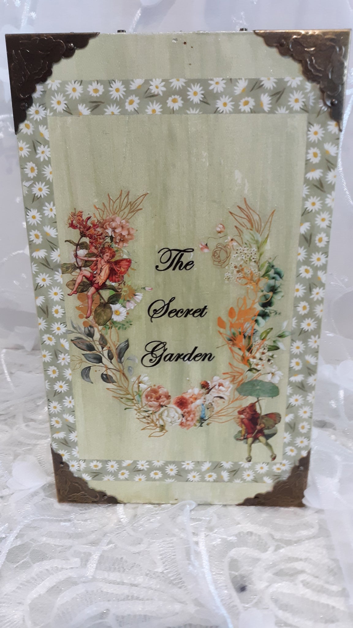 The lighting incorporates 3 LEDs powered by (2) CR 2032 3V batteries; the battery compartment is easily accessible. A handmade resin depiction of another hidden garden rests on the bench, and the key to open the gate doubles as a bookmark for the book. Glow-in-the-dark tape encircles the edges of the bookbox, adding just a touch more fun. A velvet ribbon with a snap keeps the book secure when it's not being read.