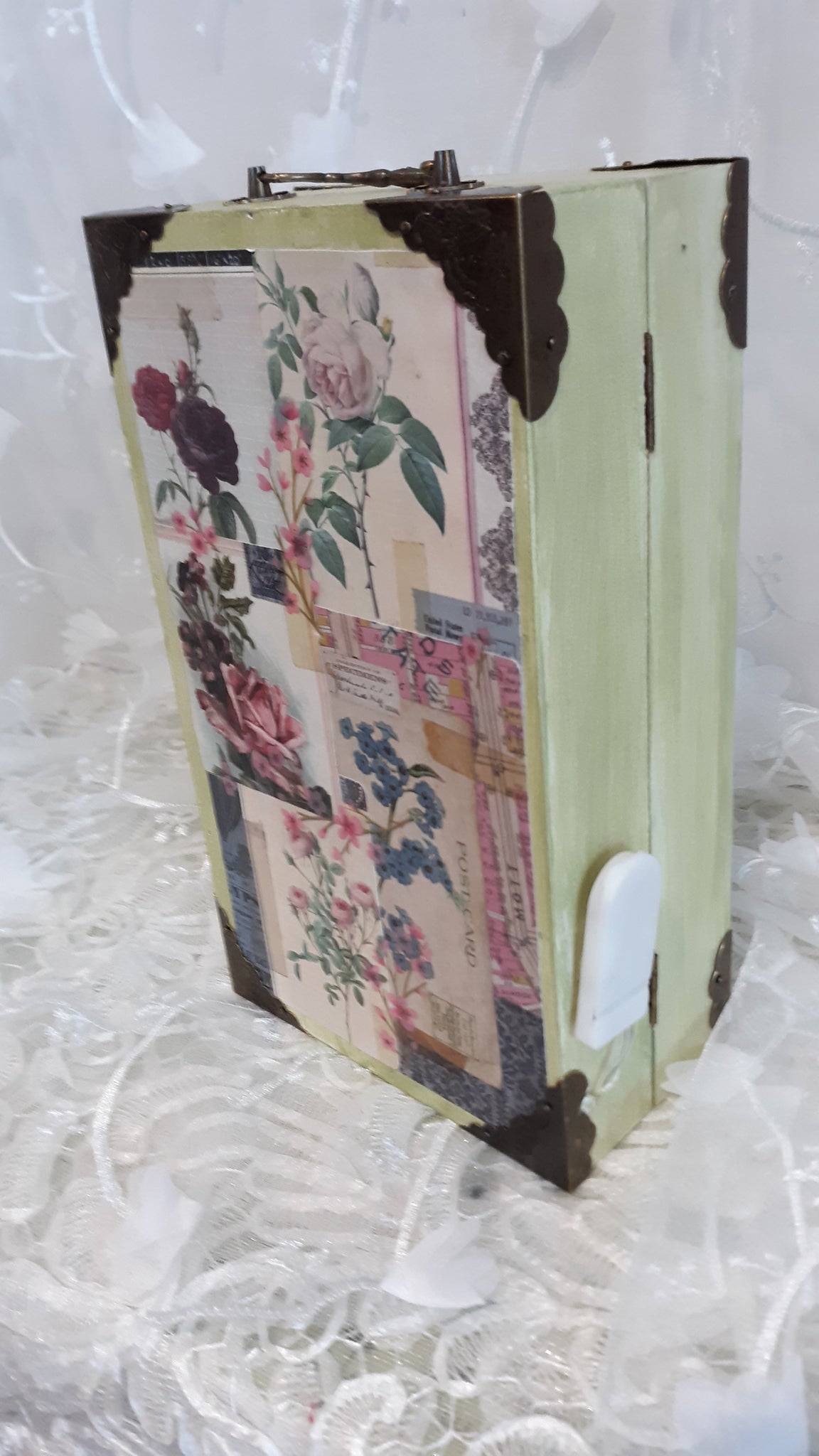 The bookbox measures 10 inches tall, 6 inches in depth and 3 inches wide. A metal handle on top makes it easy to carry, and two metal latches on the side keep the contents secure.