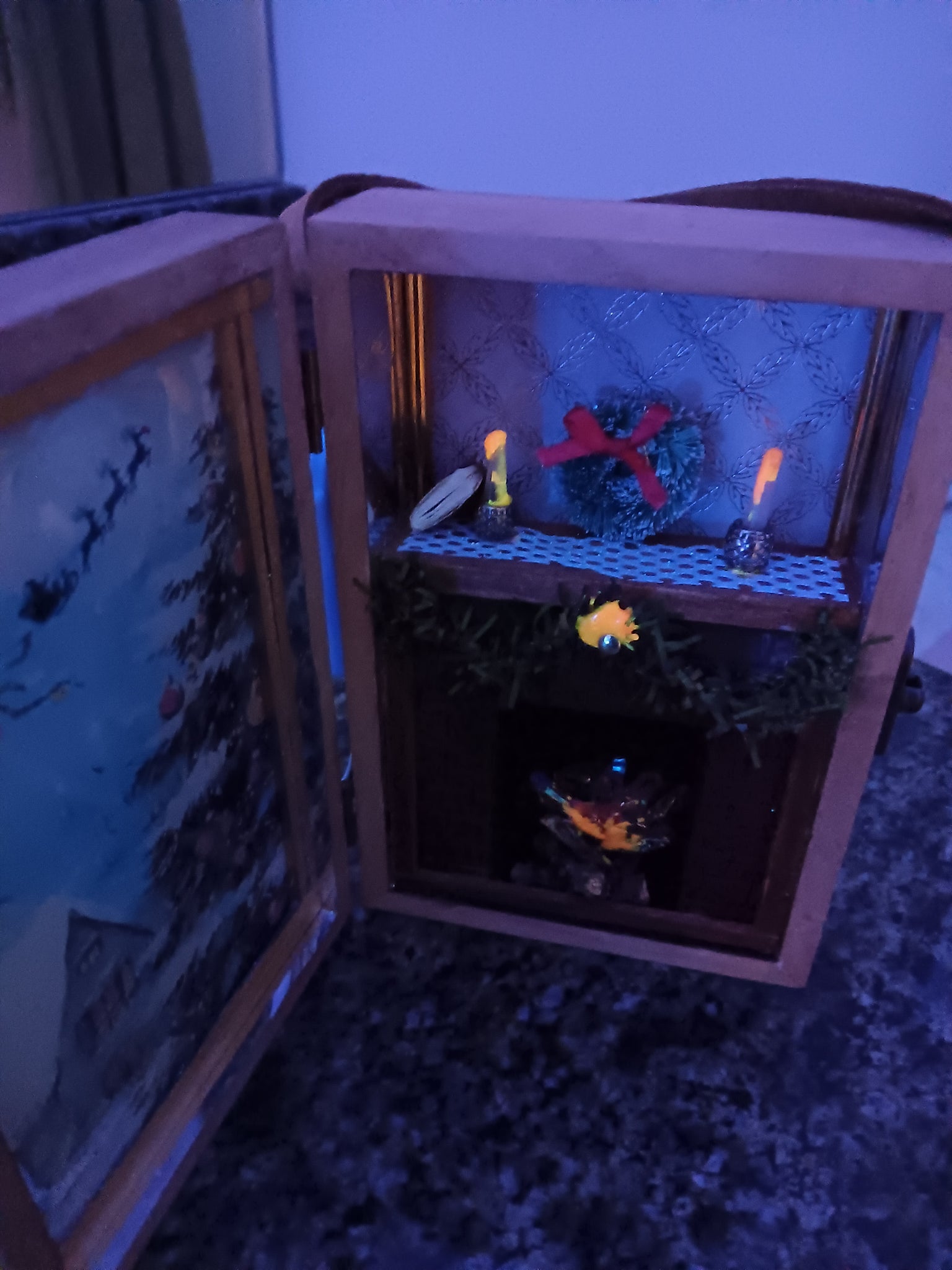 "’Twas the Night Before Christmas" presents a meticulously crafted miniature scene that aims to capture the warmth and enchantment of the renowned holiday poem. This concept originated with my initial creation—a vintage Christmas box featuring Santa on the front, which was received for storing treasured items. Inspired by this box and the poem, I conceptualized the bookbox as a unique form of diorama.