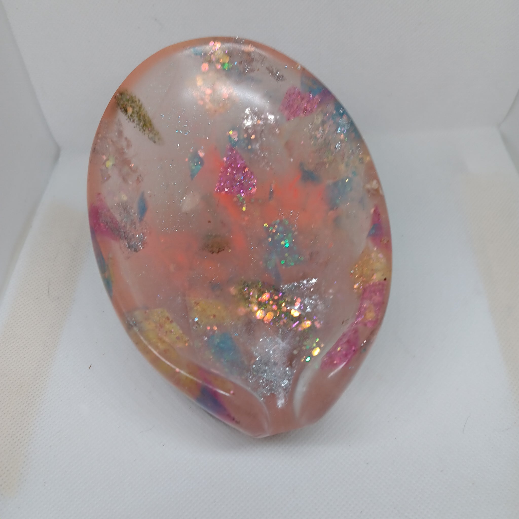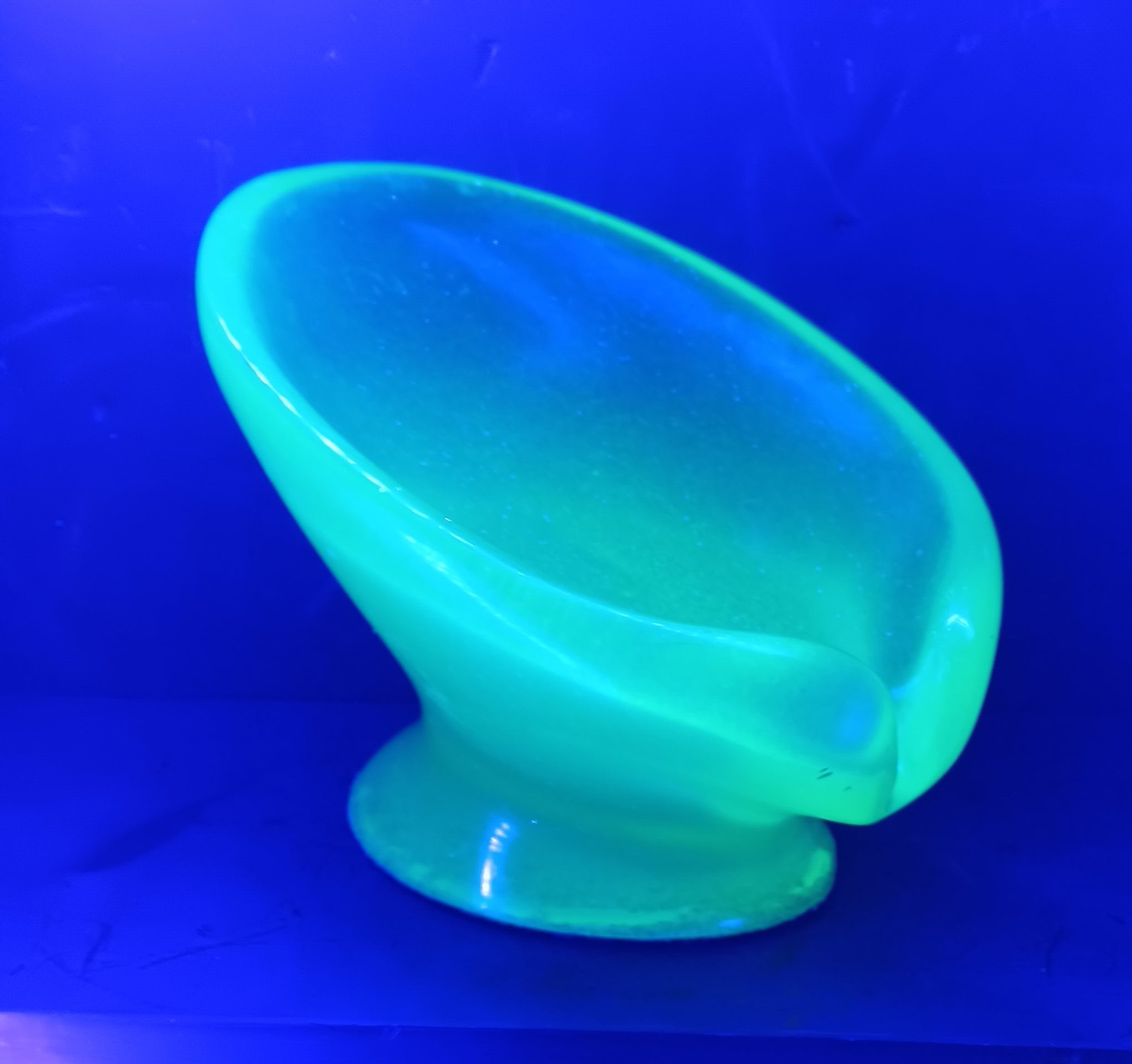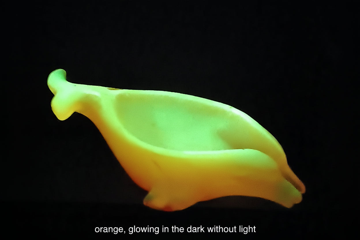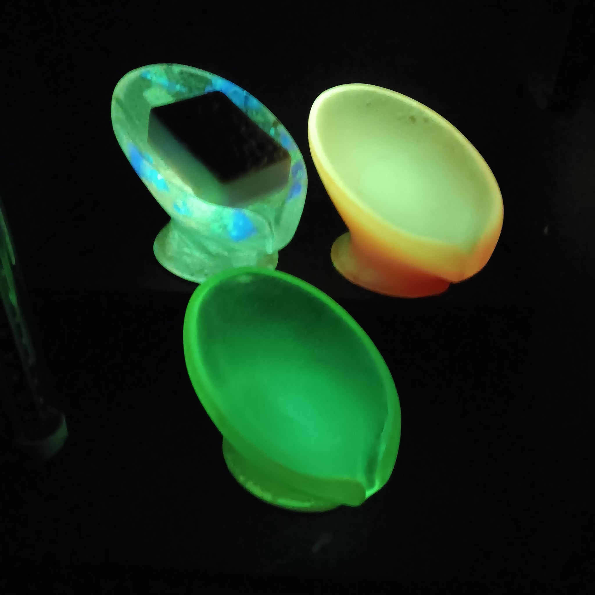 The pictures show the soap dishes under normal light, UV light, and glowing in the dark.